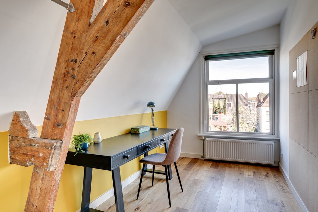 Via de trap in de hal kom je op tweede verdieping. Hier bevinden zich drie slaapkamers, een grote overloop die als werkruimte kan fungeren en een luxe badkamer voorzien van alle gemakken zoals een ligbad, douche, dubbele wastafel en toilet. Op de overloop zit ook een vaste kast met de wasmachine en CV. Wat op deze verdieping opvalt zijn de prachtige balken die in alle ruimtes in het zicht zijn gelaten en het pand karakter geven. De master bedroom ligt aan de achterzijde en heeft een tweepersoonsbed.