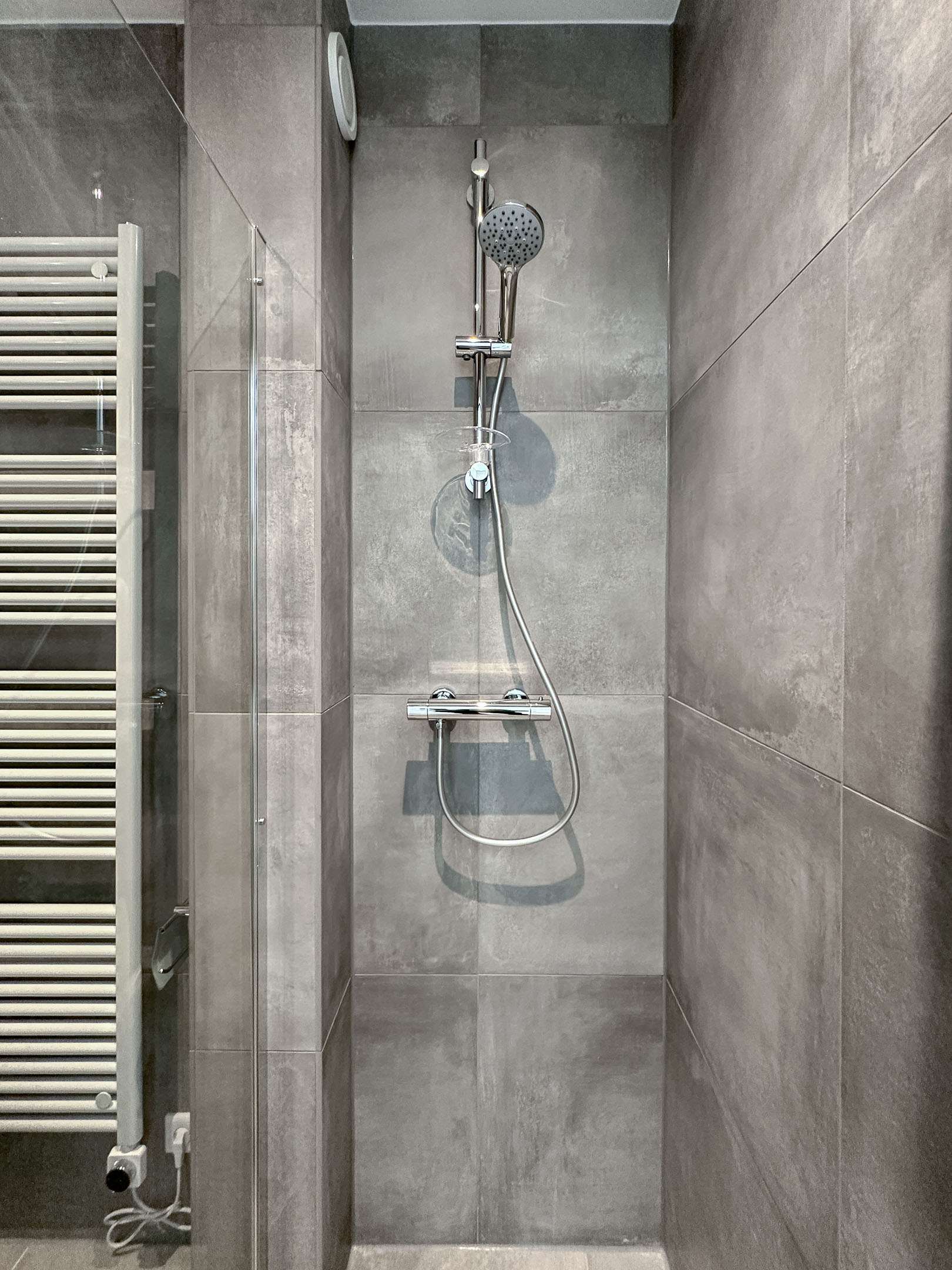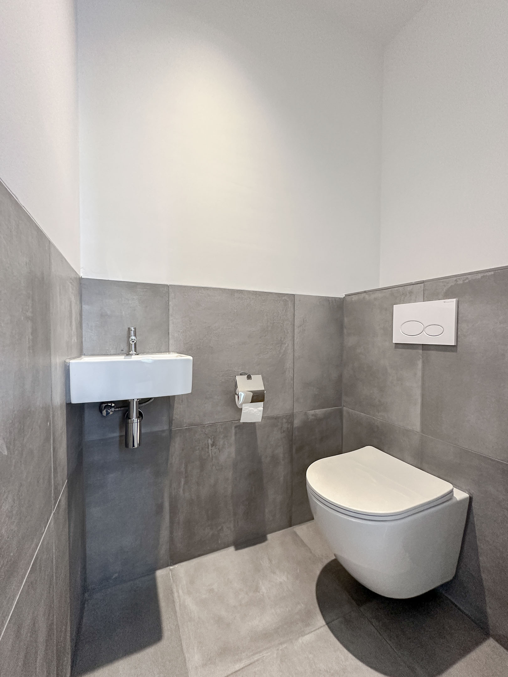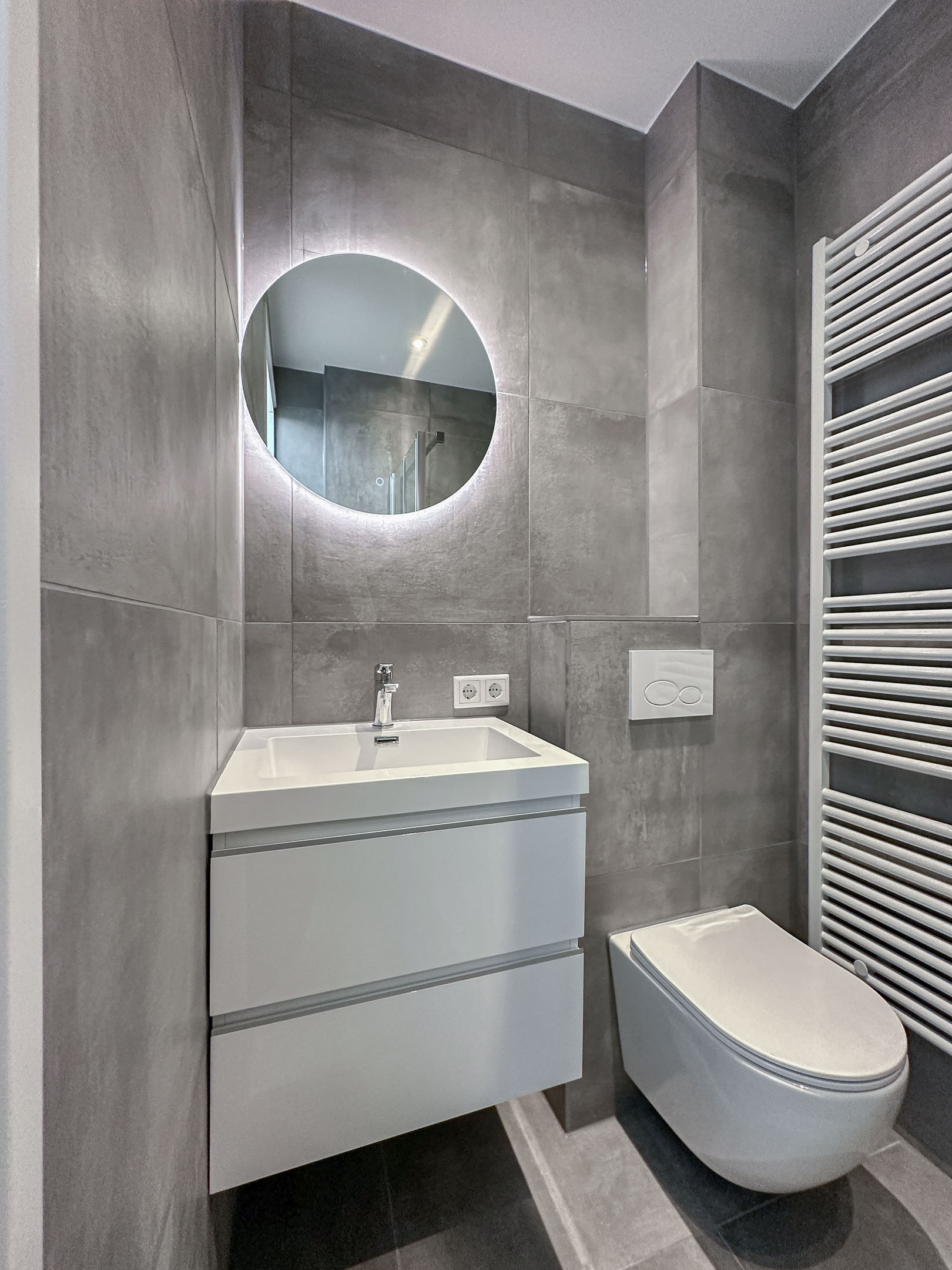 De moderne badkamer is compleet uitgevoerd met een douche, tweede toilet en een wastafelmeubel, verwarmde spiegel en een 2e zwevend toilet.