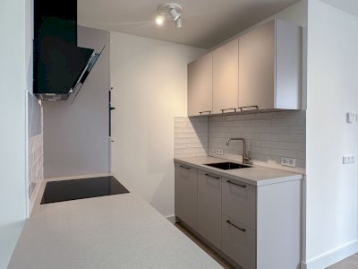 Entrance, hallway, modern toilet with a sink. From the hallway, you enter the spacious and bright living area, finished with a stylish herringbone floor with comfortable underfloor heating. The luxurious open kitchen is fully equipped with various built-in appliances.