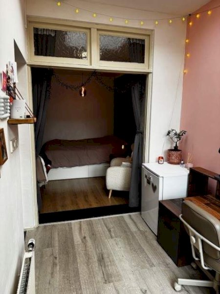Lichte kamer met een apart slaapkamergedeelte en woongedeelte, op de begane grond van een gezellig klein studentenhuis, waarbij de huurder gebruik kan maken van de gemeenschappelijke keuken eveneens op de begane grond.