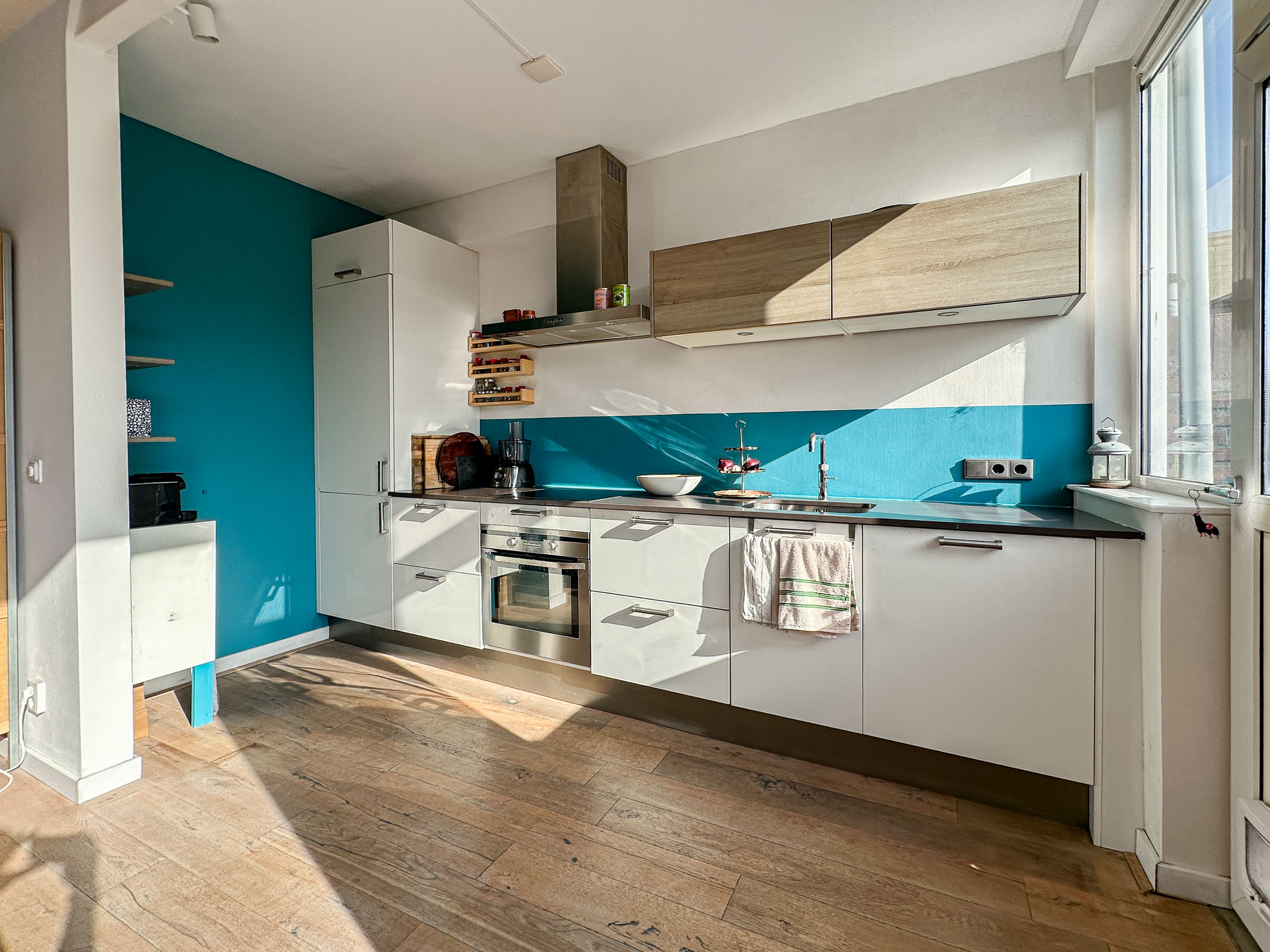 De ruime open keuken vormt het hart van de verdieping en is volledig uitgerust met alle gewenste inbouwapparatuur, waaronder een koelkast, vriezer, oven en vaatwasser. Ideaal voor wie houdt van koken en gezellig samenzijn.