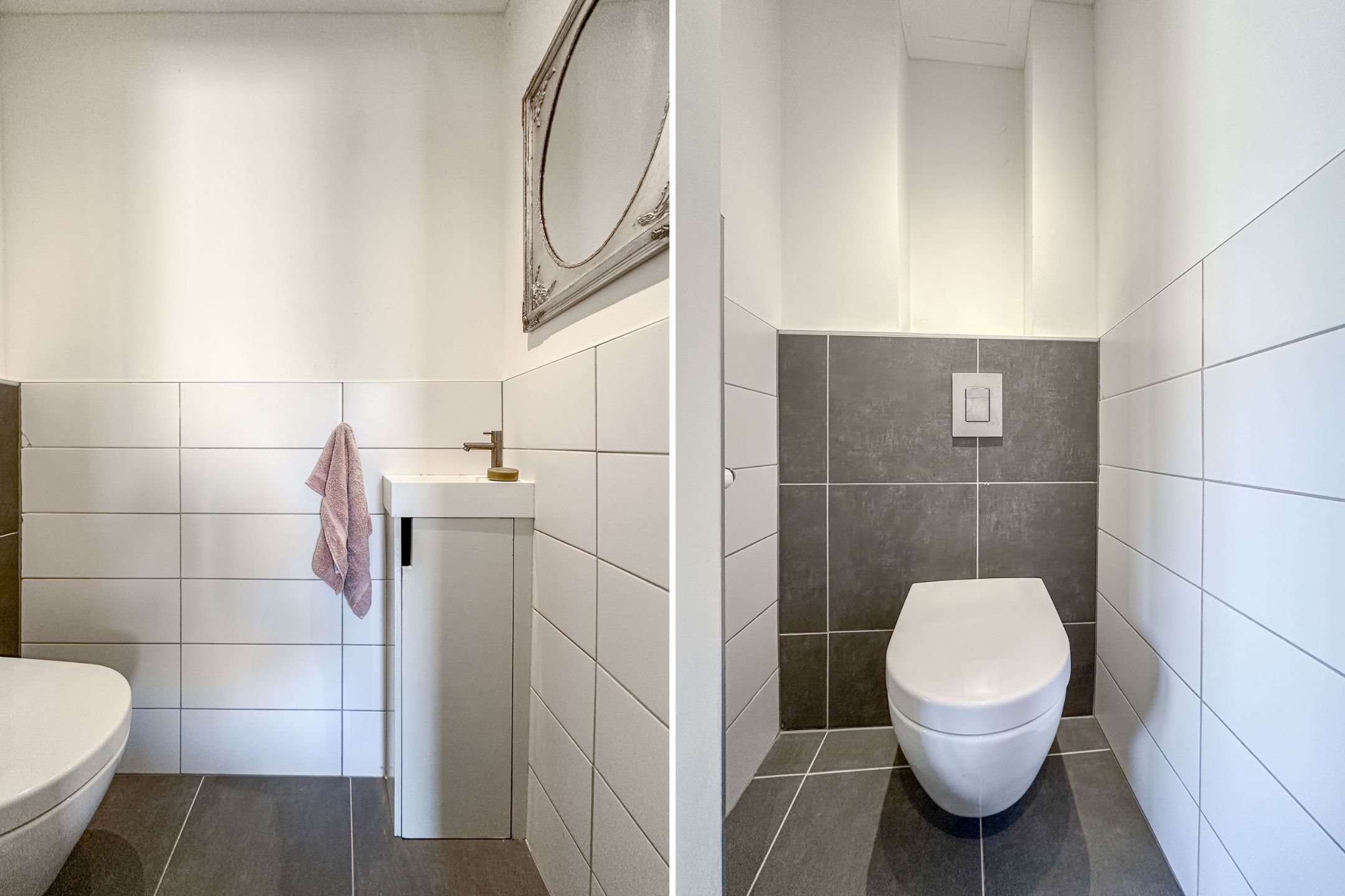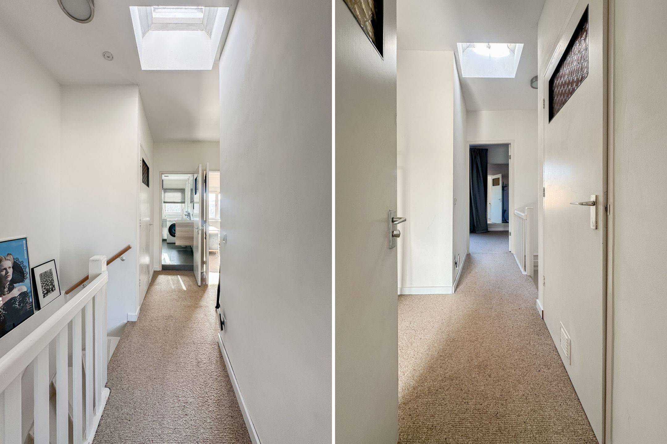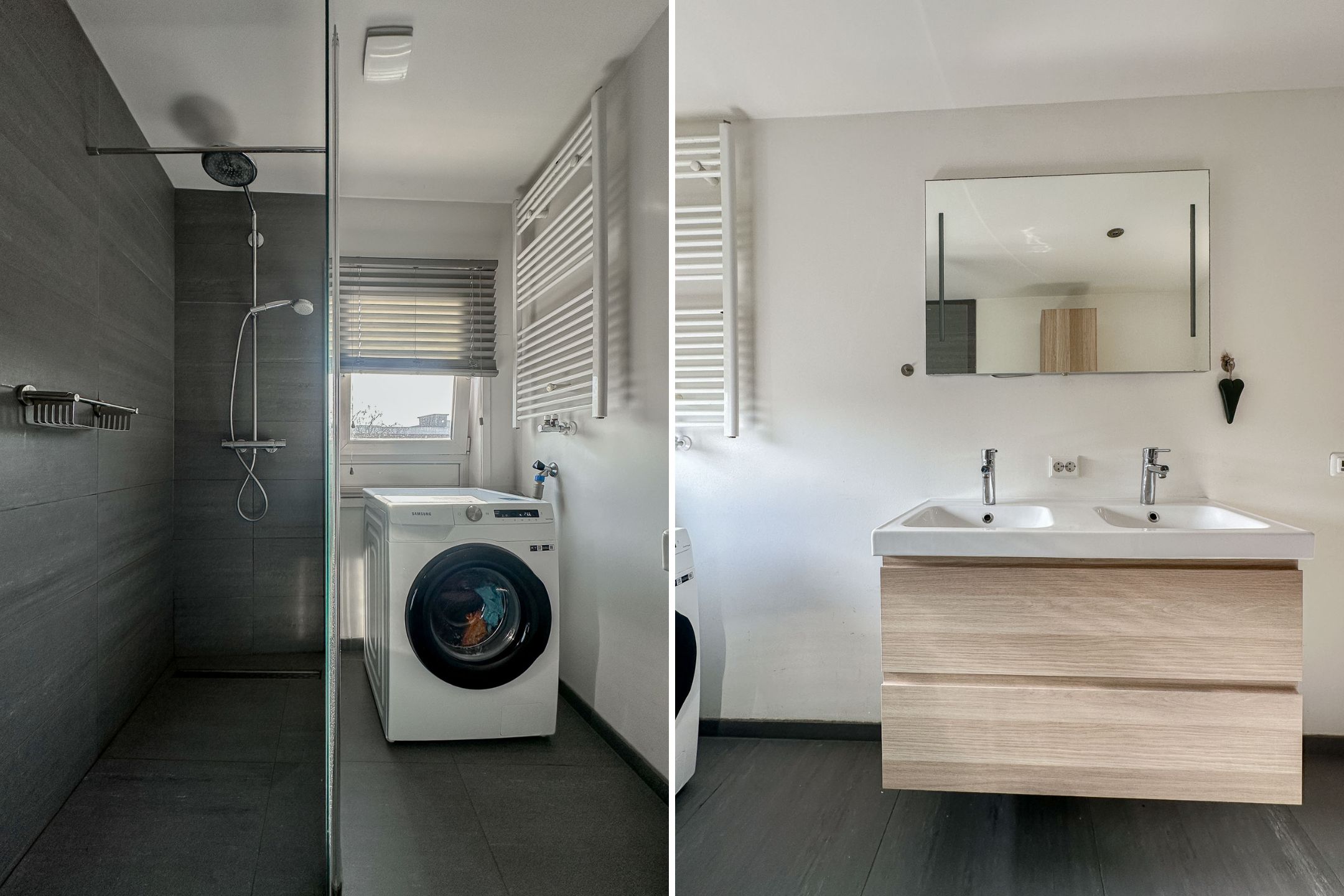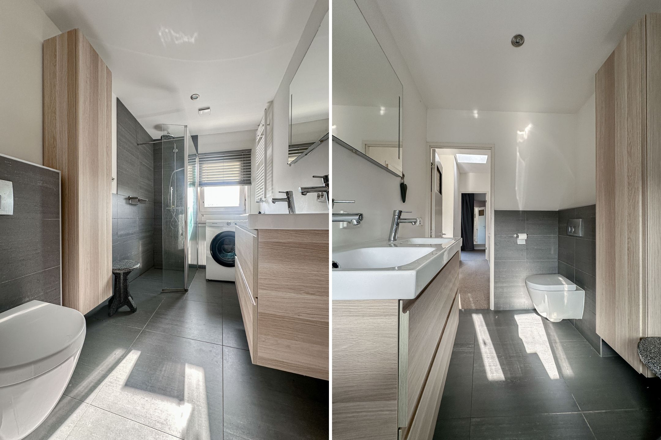 On the landing, there is a spacious wall of closets providing ample practical storage space. Additionally, you will find the modern and fully equipped bathroom here, featuring a spacious walk-in shower, a washbasin with a stylish vanity unit, and a toilet. Furthermore, a washing machine and dryer are present in the bathroom, ensuring extra comfort and convenience.